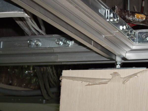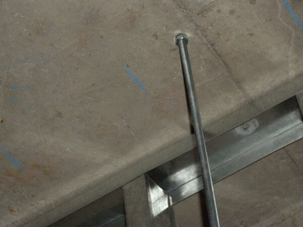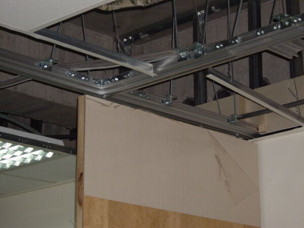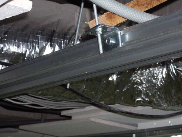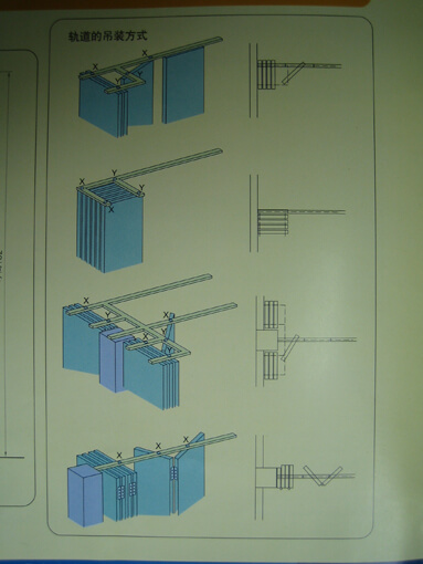 施工現塲天花板是輕鋼架,所以必須先將天花板拆開等萬向軌道固定好再將天花板修補。由於門片高度有282公分重量不輕,所以軌道必須架設牢固。軌道固定方法可以使用C型鋼固定,也可以使用內芽壁虎加上全牙吊筋及萬向軌道固定配件施工。